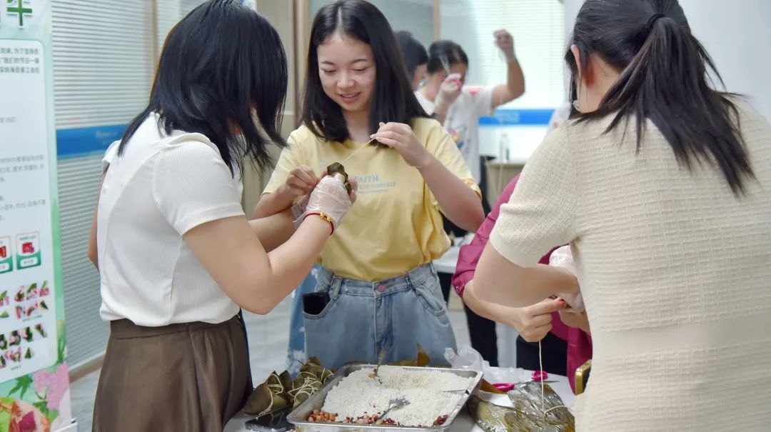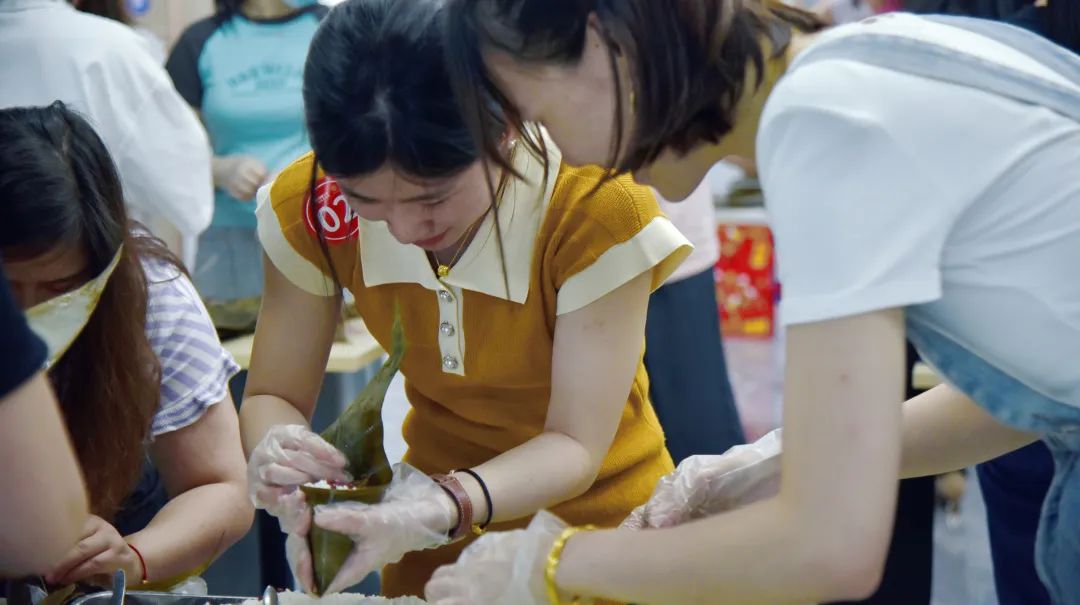 一捧艾葉草,黏甜糯米香。參賽的小伙伴們,圍成一圈,攏葉、加米、綁繩、系結(jié),或是有條不紊,或是手忙腳亂,比賽場上歡聲笑語不絕。